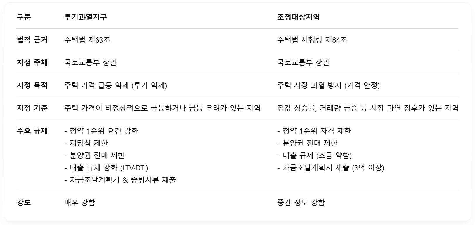 - 조정대상지역 : 부동산 시장 조정이 필요한 지역 > 1차 규제 수준